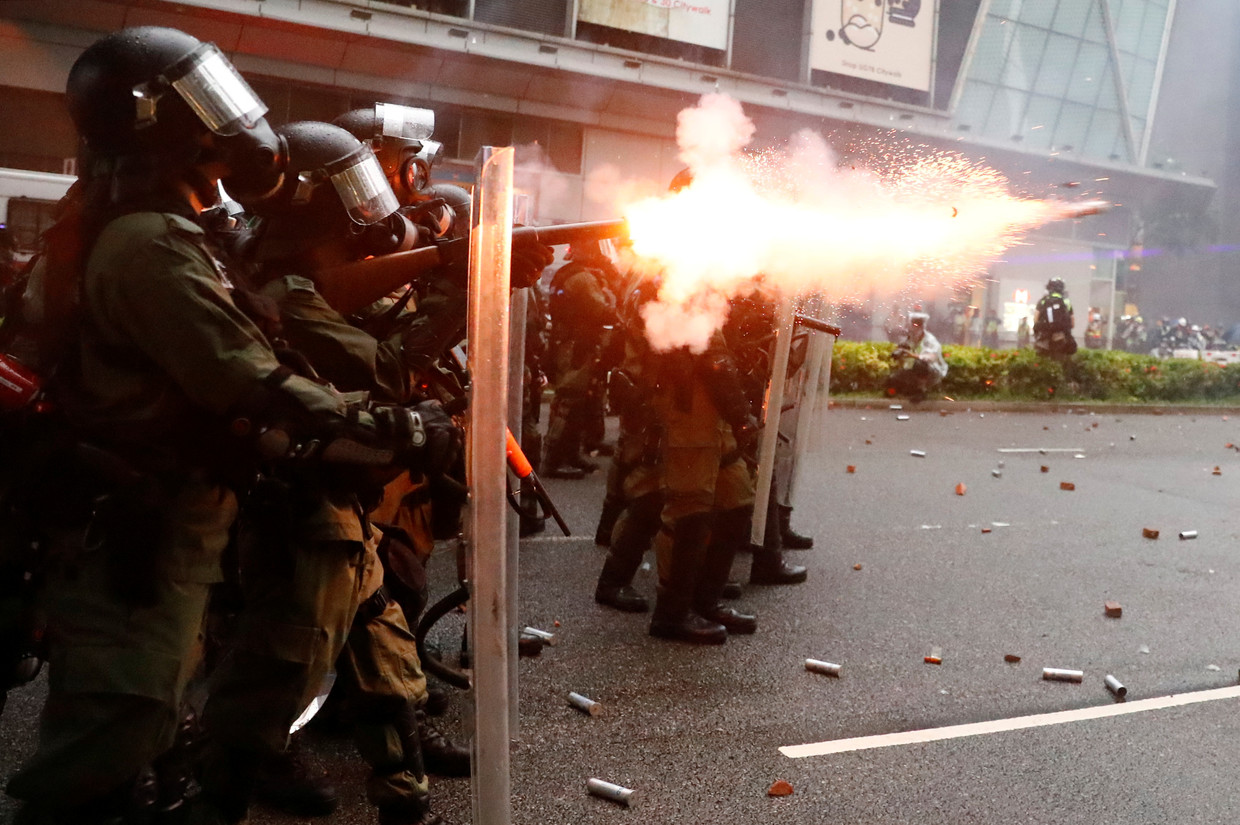 A riot police shoots a tear gas canister during a protest in Tsuen Wan, in Hong Kong, China, August 25, 2019. © REUTERS/Kai Pfaffenbach