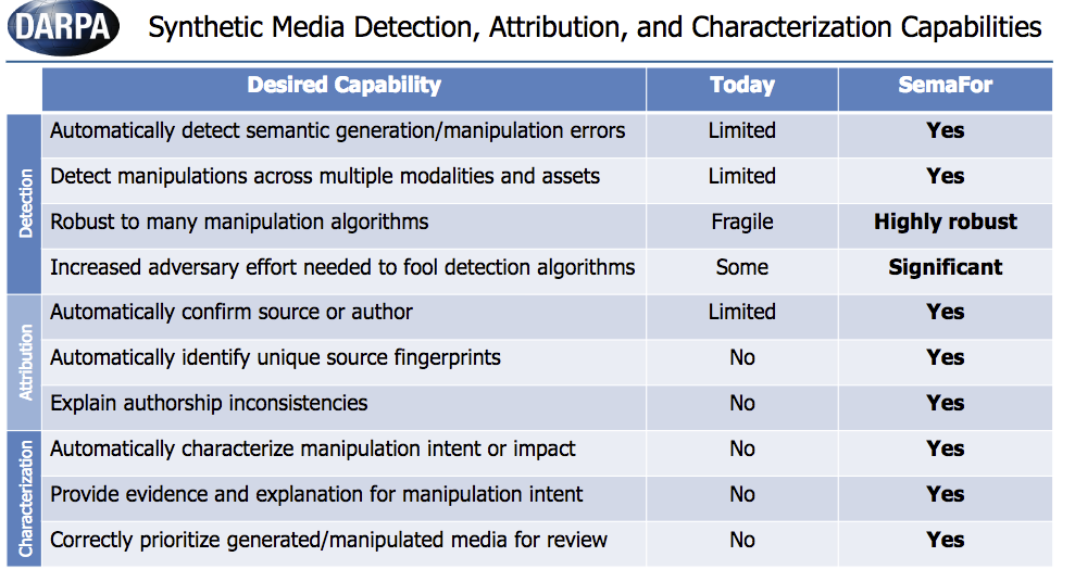 The Semantic Forensics program will scan news stories and social media posts with a barrage of algorithms in the hope of identifying inconsistencies that could mark a story as fake. The desired program will not just identify a meme as inauthentic – it will identify the source of that meme, the alleged intent behind it, and predict the impact of its spread.