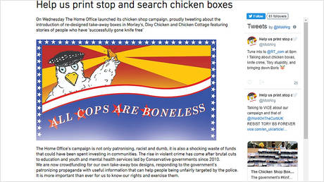 ‘All cops are boneless’: UK govt’s #knifefree chicken boxes ridiculed by crowdfunded alternative