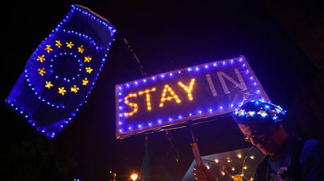 Anti-Brexit demonstrators stand outside the Houses of Parliament in London © Reuters / Hannah McKay