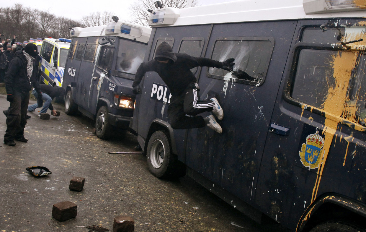 A protester kicks the side of a police van during an anti-Israel demonstration in Malmo © REUTERS / Bob Strong