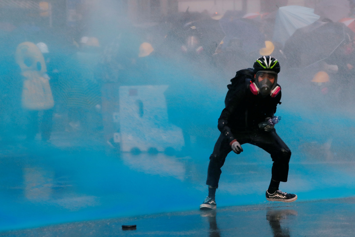 The police responded with water cannons spraying the demonstrators with bright blue-colored fluid. Such coloration facilitates the search to arrest them after they have dispersed.