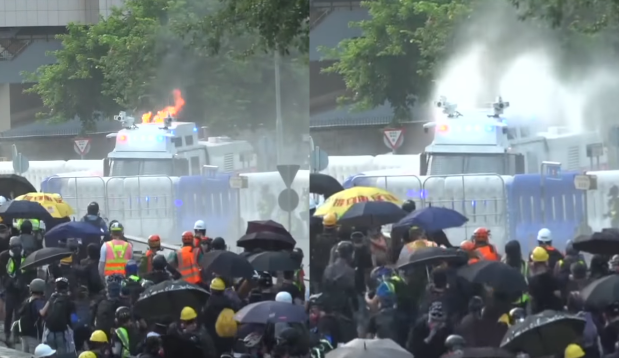One protester managed to land a Molotov cocktail on one of the water cannons and it caught fire, footage shows. The machine, however, turned out to be equipped with roof sprinklers and promptly extinguished itself.