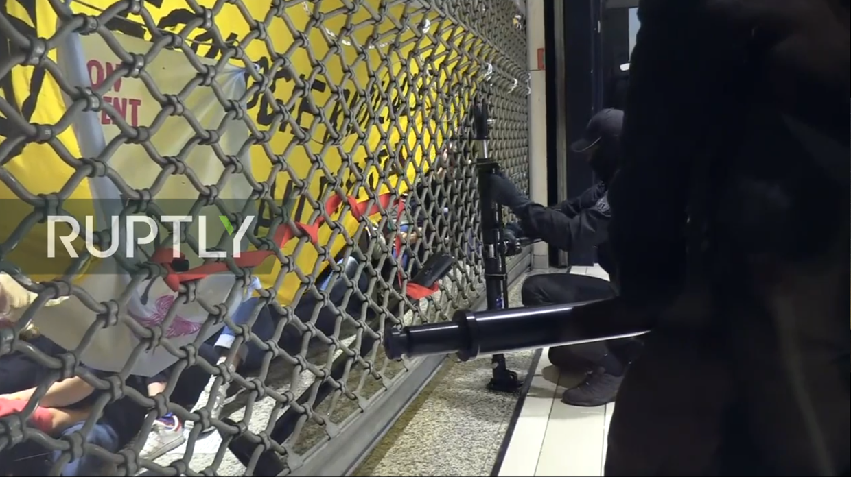 By around 9pm local time, several masked officers used hydraulic pistons to force-open steel shutters that the protesters used as barricades, and approached the mesh fence behind the barrier with bolt cutters.