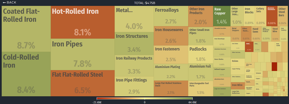 Iran’s total $4.75 billion of metal imports in 2017, split by sub-category.