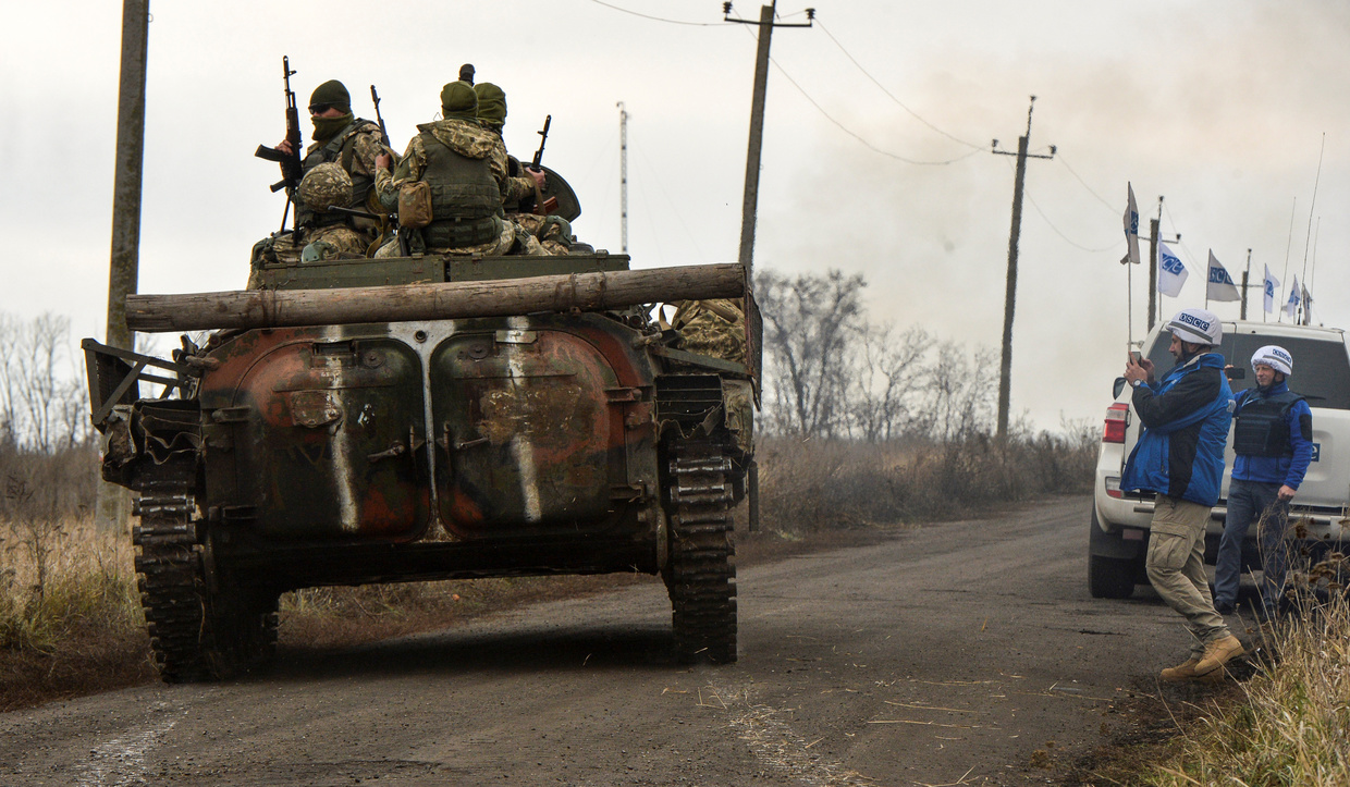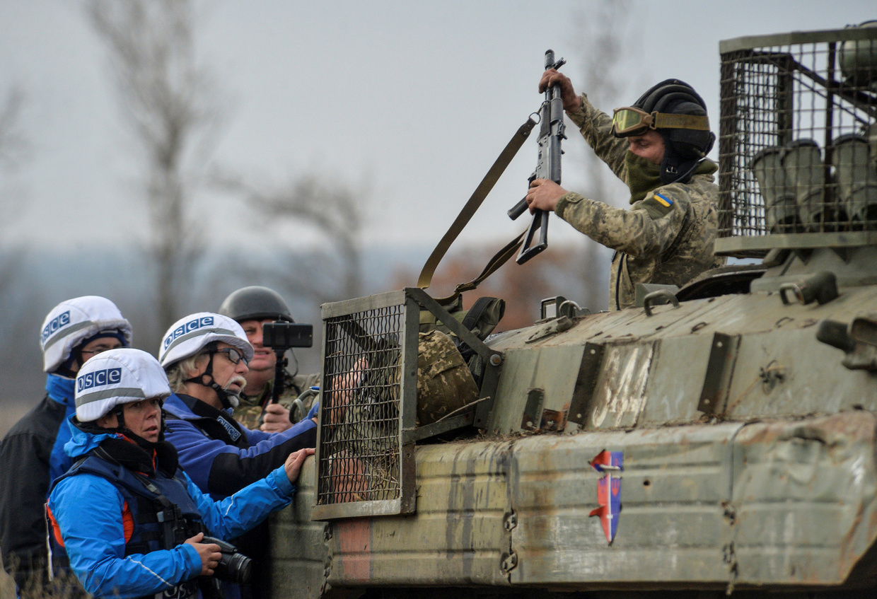 Members of the OSCE Special Monitoring Mission to Ukraine watch Ukrainian servicemen.