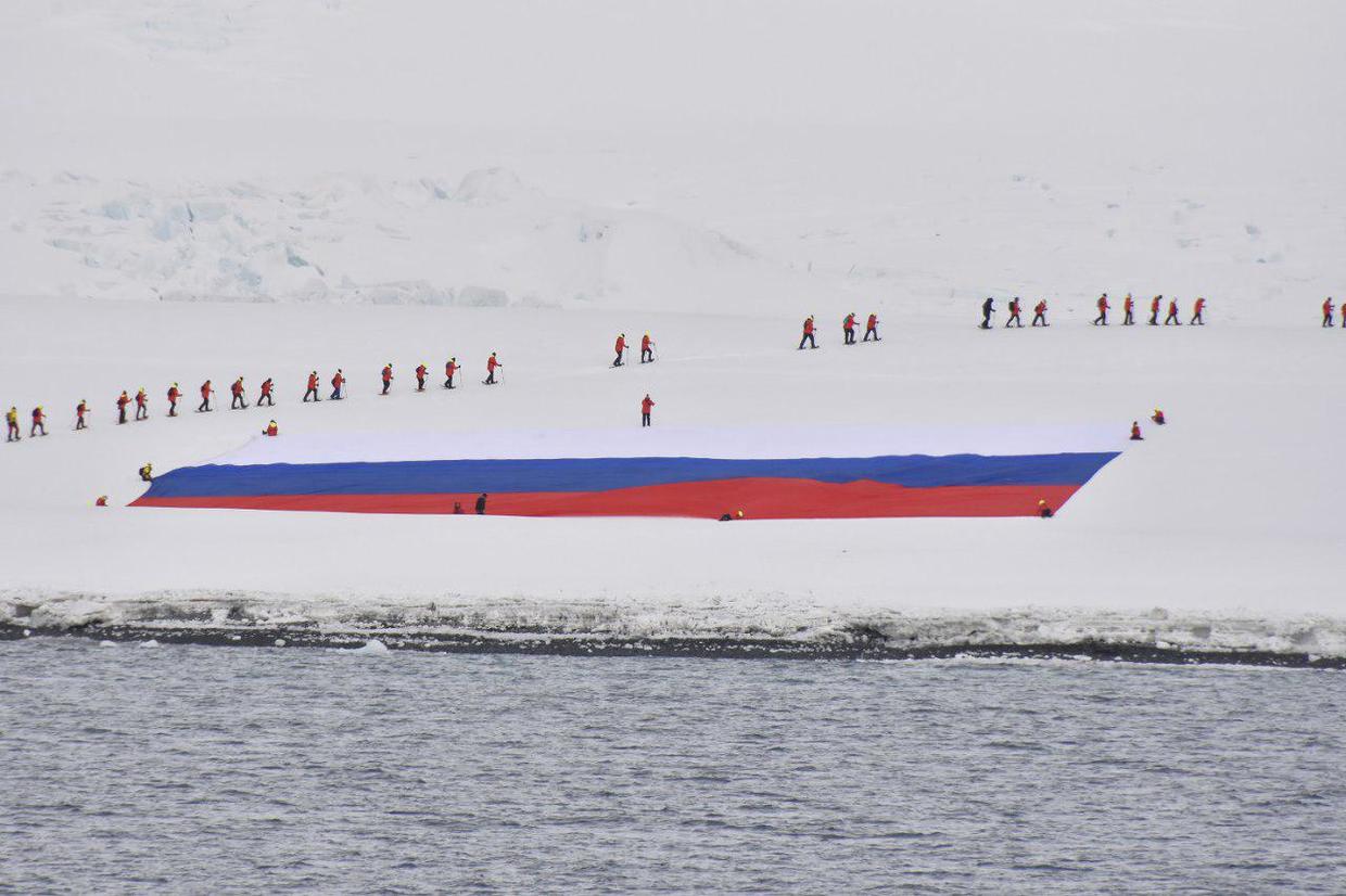 Photos show the massive Russian tricolor, measuring a whopping 1,423 square meters unfurled, amid the desolate Antarctic desert. The tiny human figurines seen in the shots are members of the notorious motorcycle club and the ‘All Worlds’ patriotic organization.