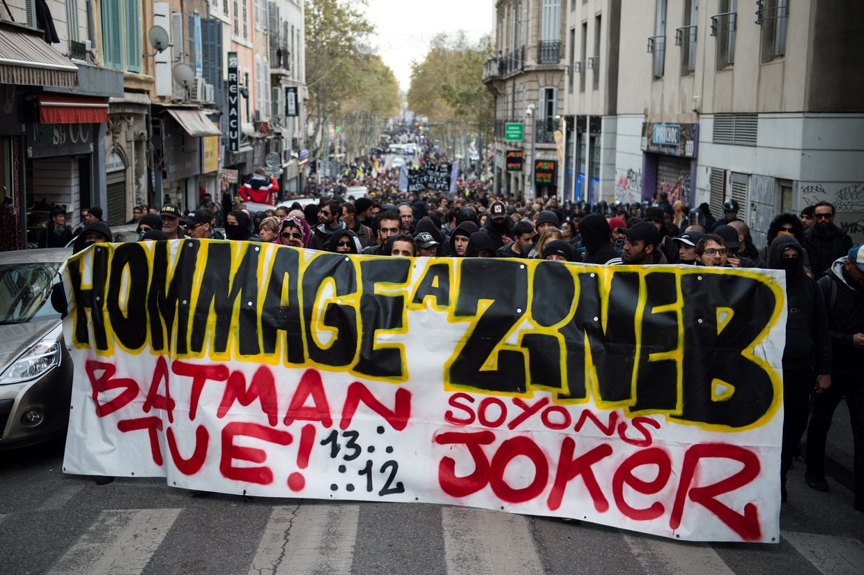 The demonstrators carried a large banner, reading “Tribute to Zineb. Batman kills, let’s be Joker!” and chanted “We are all children of Zineb!” They marched past the apartment in Marseille’s old city where Redouane used to live.