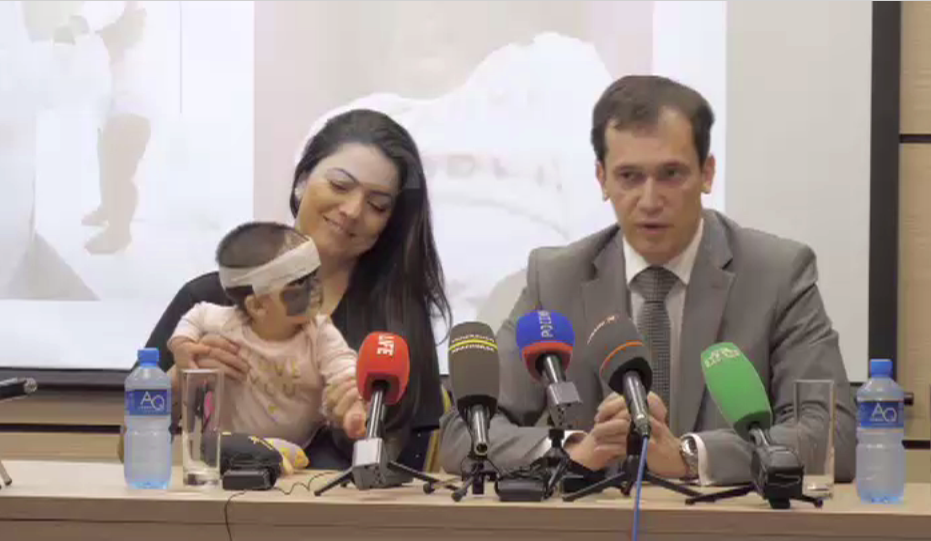 Carol Fenner and her daughter Luna sit next to Dr. Pavel Popov at the press confernce in Krasnodar, Russia, following the operation.