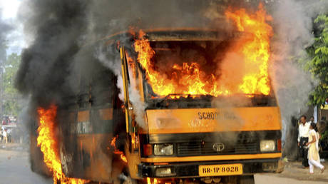 Massive fire & series of explosions after Indian gas truck hits SCHOOL BUS in head-on collision (VIDEOS)