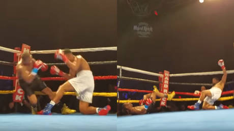 Wearing red shorts in front of an amazed crowd, one of the combatants can be seen stumbling groggily back toward the ropes, having used them to climb off the deck.