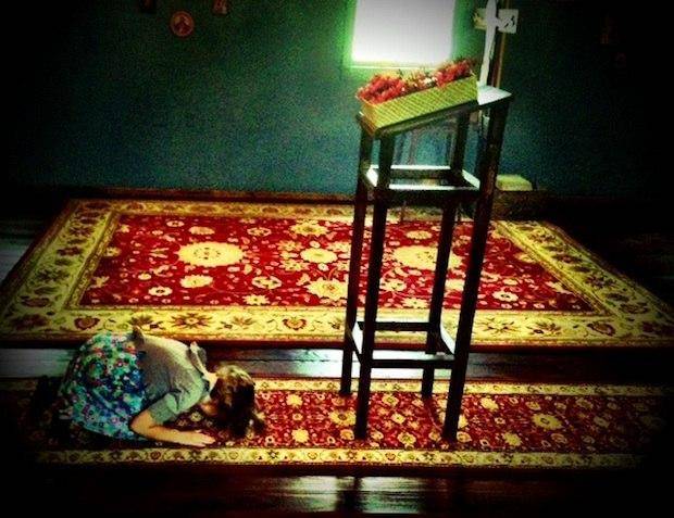 My Orthodox Christian daughter, circa 2013, prostrating before the Holy Cross